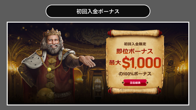 | 初回入金即位ボーナス | 初回入金で最高$1,000の100%入金ボーナス進呈 |