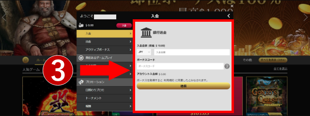 登録手続きが完了したら、ウィニングキングスで遊ぶ資金を入金しましょう。