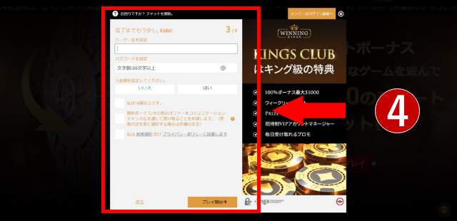 最後に「プレイ開始」をクリックすれば、ウィニングキングスの登録手続きは完了です。