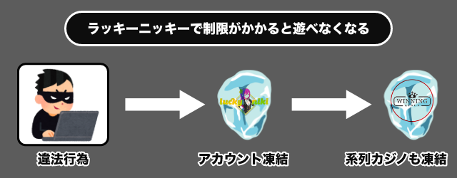 たとえば、ラッキーニッキーカジノでアカウント凍結処置を受けたことがあるプレイヤーや、アカウントを自ら停止したプレイヤーはウィニングキングスに登録すらできません。これは逆もまた同じで、ウィニングキングスで遊べなくなったら、ラッキーニッキーカジノでも遊べなくなります。