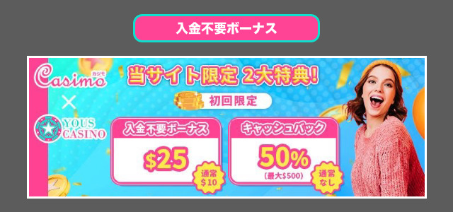 | 入金不要ボーナス | 登録後サポートに合言葉「casimo25」を送れば$25入金不要ボーナス進呈。 |