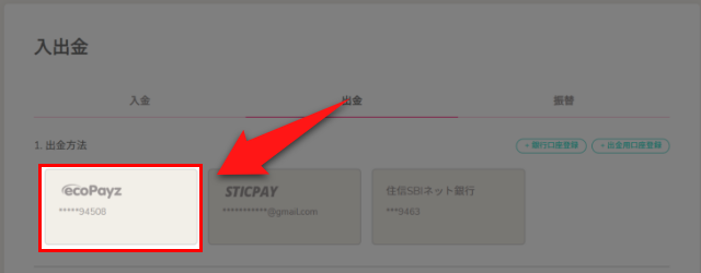 出金ページでは、まず「1.出金方法」で先ほど連携した決済口座を選択します。