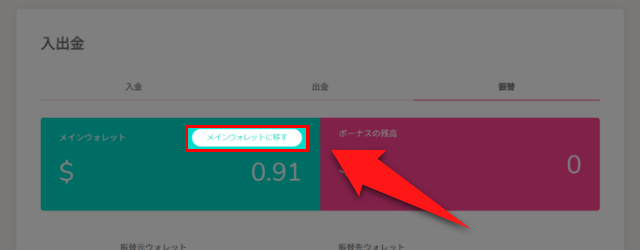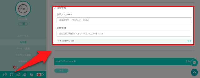 メインウォレットに残高を移動したら、あとは出金手続きを済ませるだけです。