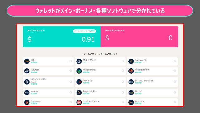 ユースカジノのウォレットはソフトウェア会社ごとに分かれているため、複数ソフトウェアで遊びたい時に手間がかかりますが、マルチプレイウォレットなら1つのウォレットで複数ソフトウェアのゲームを遊べます。