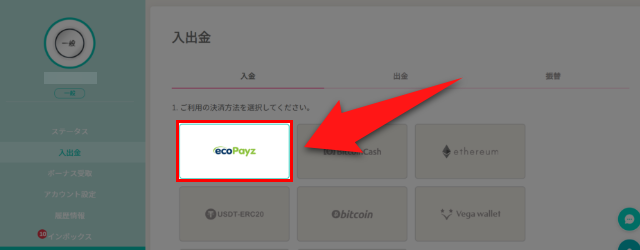上記画像はecoPayzを選んだ場合の表示です。決済パスワードや出金金額など、表示された項目はすべて入力してください。
