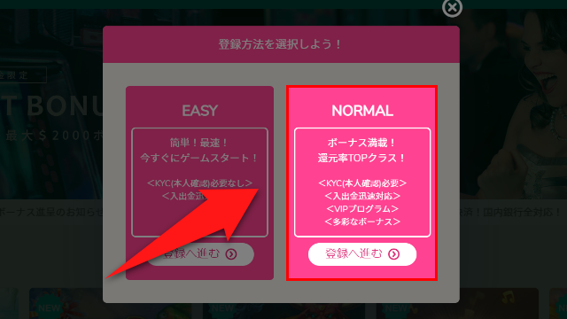 入金不要ボーナスや入金ボーナス、VIPプログラムを利用したい方にはNORMAL版、ボーナスがなくてもいいという方にはEASY版をおすすめします。