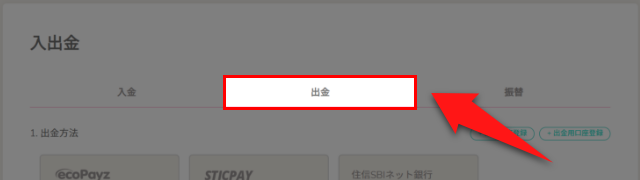 入金したときと同じように入金ページに移動し、一番上のメニューから「出金」を選択してください。