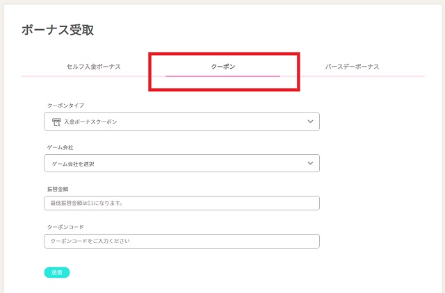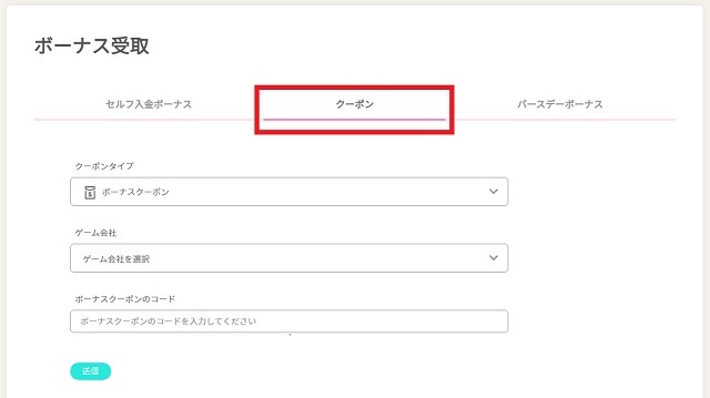 「入金ボーナスクーポン」を選択すると、ボーナス申請フォームが表示されます。