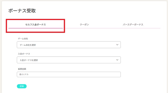 200%~120%ボーナスの場合、メニュー「ボーナス受け取り」の「セルフ入金ボーナス」ページから申請します。