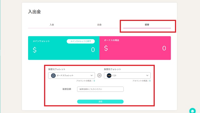 すべて入力し終えたら、「送信」をクリックしましょう。申請内容に問題がなければ、間もなくして選択したゲーム会社のウォレットに入金額とボーナス額が同時に振り替えられます。