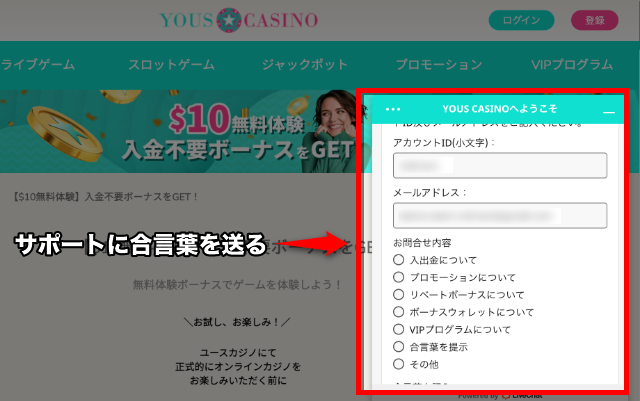 100%ボーナスの場合、まずはユースカジノのサポートにライブチャットまたはメールで以下合言葉を送ります。