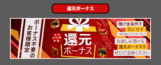 「還元ボーナス」は対象期間中の入金に対して、出金条件1倍の現金チップがつくボーナスです。