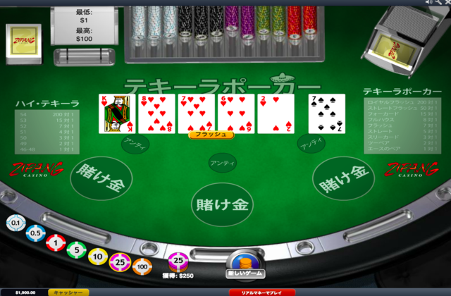 クリック後、テーブルゲームが出来る画面に移行します。ジパングカジノのテーブルゲームで遊べるポーカーは3種類あり、レートは1〜300ドルです。