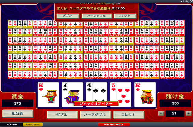 クリック後、ビデオポーカーが選択できるページに移行します。ジパングカジノのビデオポーカーは、16種類ものゲームがありレートは0.01〜250ドルです。