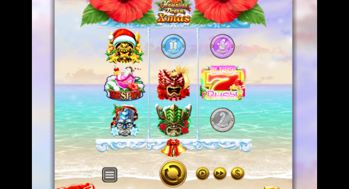 「Hawaiian Dream Xmas」は前述した「Hawaiian Dream」のクリスマスバージョンで、グラフィック面の仕様が若干変更になっています。システム面では青と赤に分かれていた「7」のスキャッターを1つに統合し、赤7と金7の2種類だけになりました。