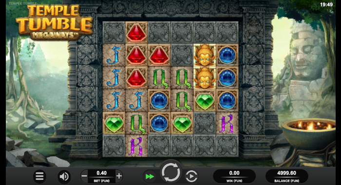 「Temple Tumble」はオーソドックスなスロットで通常の図柄の他に何も描かれていない石の図柄があり、周囲の図柄が揃うと隣接する石の図柄も一緒に消滅します。