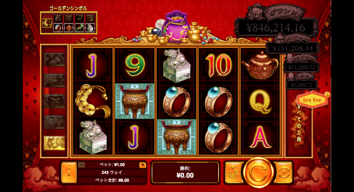「PLENTIFUL TREASURE」はジャックポット対応機種で、通常のベットとは別に5段階の追加ベットをすることで、ジャックポットによる獲得金額が変わります。