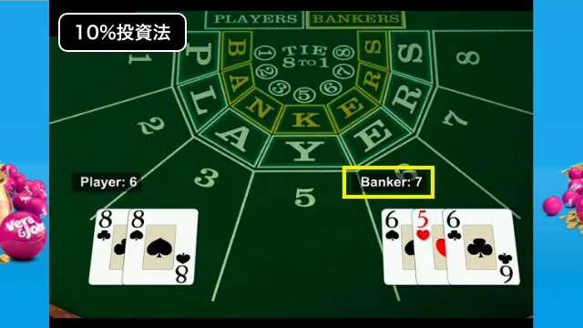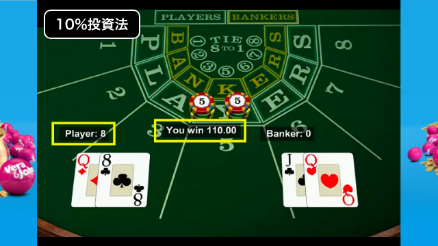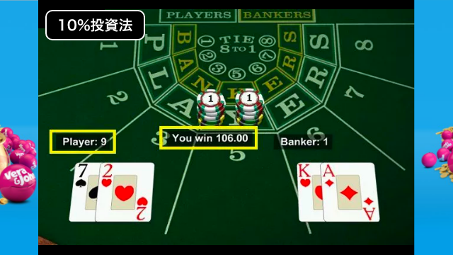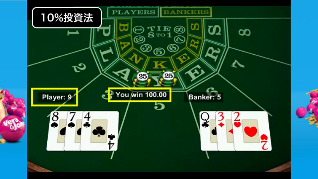10%投資法は勝率1/2のカジノゲームで使用することができるので、バカラで配当2倍のPLAYERに賭け続けてみます。
