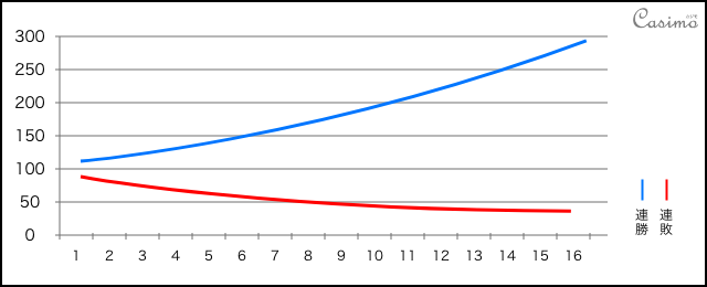 青線(連勝)に比べると、赤線(連敗)の方が緩やかなのが分かりますね。