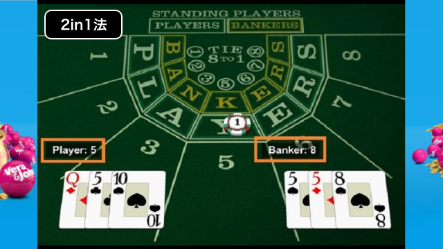 結果:PLAYER「5」、BANKER「8」 勝敗:×