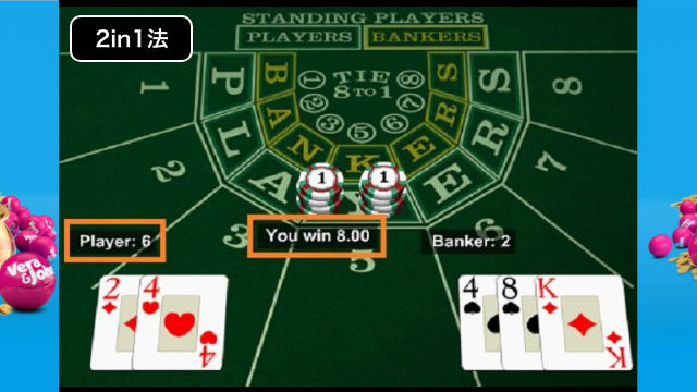 2in1法は勝率1/2のカジノゲームで使用することができるので、バカラで配当2倍のPLAYERに賭け続けてみます。