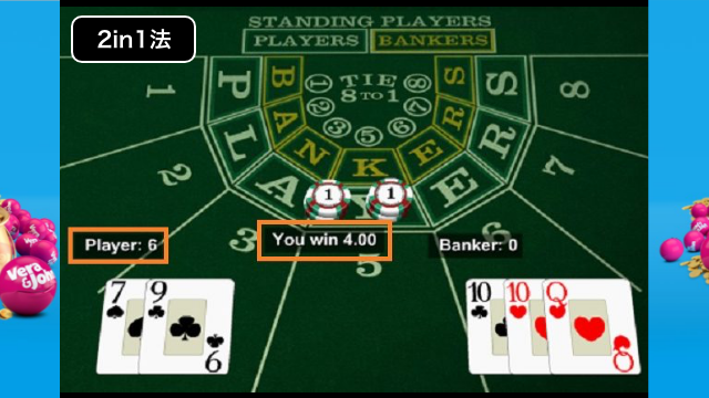 結果:PLAYER「6」、BANKER「0」 勝敗:○