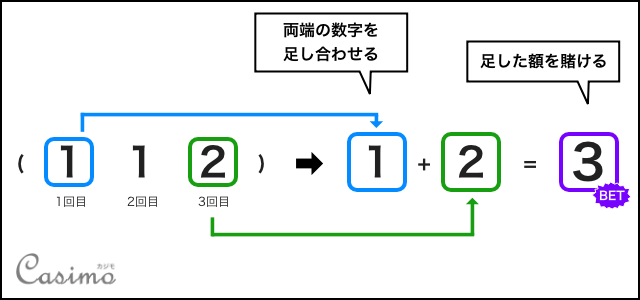 ④次ゲームでは左端と右端の数字(1,2)を足し合わせた額を賭ける