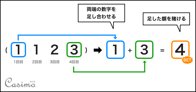 ④次ゲームでは左端と右端の数字(1,3)を足し合わせた額を賭ける