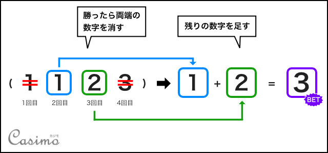 次ゲームでは残った数字の左端と右端(1,2)を足し合わせた額を賭ける
