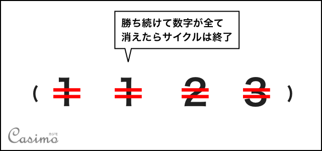 また、この手法を使って勝ちが続いたとしても、数列が消えれば賭け金は変わらないので、勝ちが続いても利益が伸びる効果は期待できません。