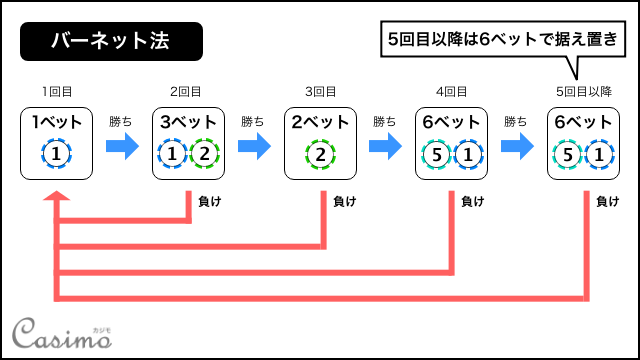 バーネット法は、連勝時に賭け金を「1,3,2,6」の順に変えていく必勝法です。