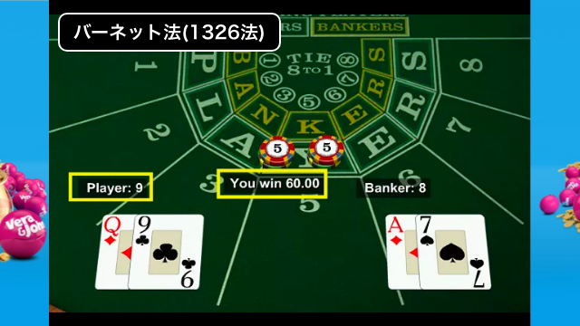 バーネット法は勝率1/2のカジノゲームで使用することができるので、バカラで配当2倍のPLAYERに賭け続けてみます。