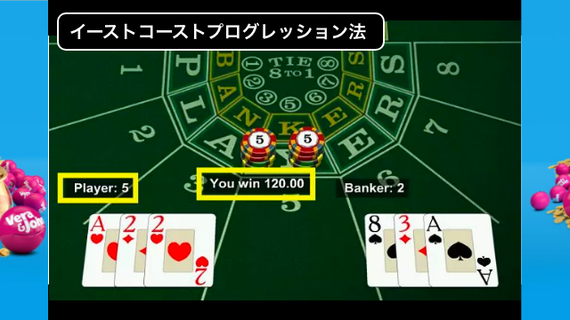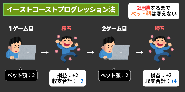 イーストコーストプログレッション法は、連勝時に次回ゲームへ利益の半分を上乗せする必勝法です。