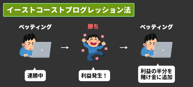 イーストコーストプログレッション法は、連勝で得た利益の半分を確保し、残り半分を賭け金に上乗せする必勝法です。