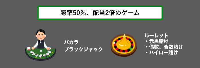 具体的にはバカラ、ブラックジャック、ルーレットのイーブンベット(赤黒賭け、偶数・奇数賭け、ハイロー賭け)、シックボーの大小賭けです。