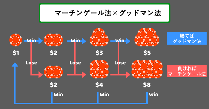 これはグッドマン法が2ゲーム目で1ゲーム目の倍額賭けなければけないためで、勝ち負け交互だとその倍額ベットしたときに負けるからです。