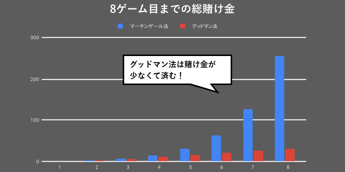 シミュレーションで確認したとおり、グッドマン法は勝ち負けが交互にくる展開に弱く、勝ち負け交互を繰り返せば繰り返すほどじわじわと損失が増えていきます。