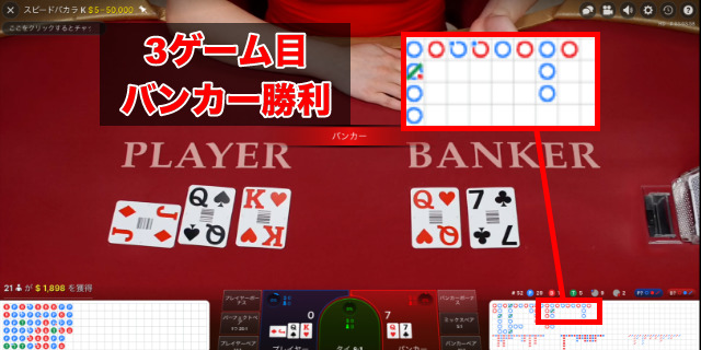 プレイヤーもしくはバンカーが3回連続で出るまで待ちましょう。どちらかが3回連続で出たら片方にマーチンゲール法で賭けます。