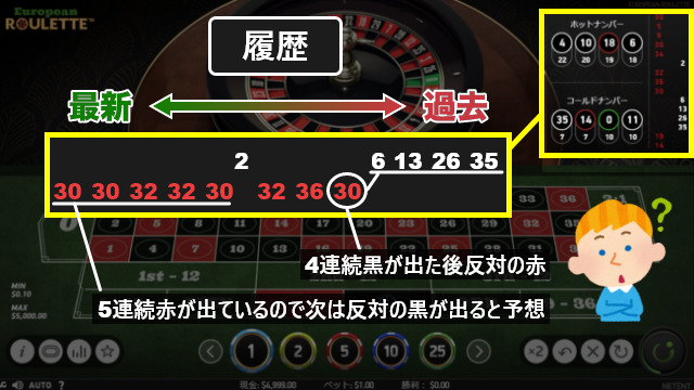 まず、から回しで赤か黒、どちらかの色が連続で3回以上でるまで待ちましょう。3回以上同じ色が出たら反対の色にマーチンゲール法を使用してください。