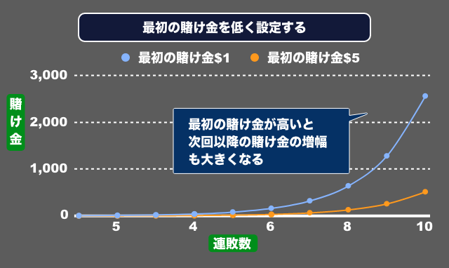 マーチンゲール法を利用する際にまず決めておくべきなのがスタート賭け金です。スタート賭け金の大きさによって賭け金の増え具合が変わってきます。