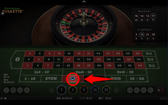マーチンゲールは配当2倍のゲームに使用できるので、ここではルーレットの赤黒賭けにの「赤」に1ドルベットします。