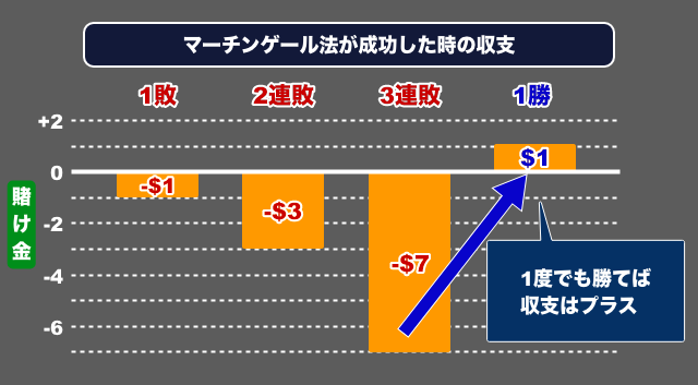 このように、マーチンゲール法は連敗数に関係なく、1勝すれば、必ずスタートのベット額分だけの利益を獲得できます。