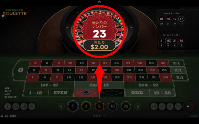 赤に1ドル賭け、「赤の23」がきました。当たりです。