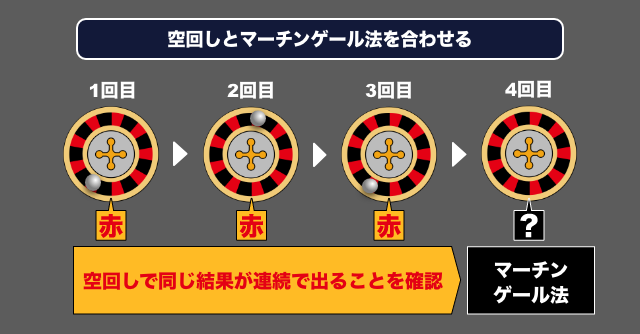 例えば、ルーレットの赤黒賭けで赤に賭けると決めておき、黒が4回連続できてからマーチンゲール法を使用します。黒が4回連続できた場合、その後数ゲームのうちに赤がきます。黒が5回、6回と続いても、資金がなくなる前に赤がくればマーチンゲール法成功です。