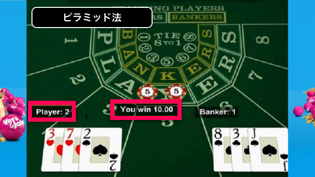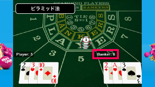 ピラミッド法は勝率1/2のカジノゲームで使用することができるので、バカラで配当2倍のPLAYERに賭け続けてみます。