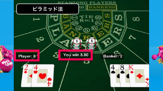 8ゲーム目:賭け金6ドル結果:PLAYER「9」、BANKER「4」でPLAYER勝利。6ドル獲得。
