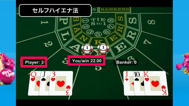 10%投資法、グランパーレー法は勝率1/2のカジノゲームで使用することができるので、バカラで配当2倍のPLAYERに賭け続けます。