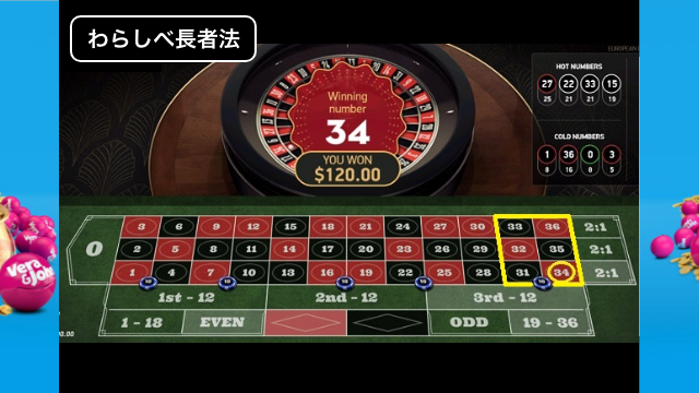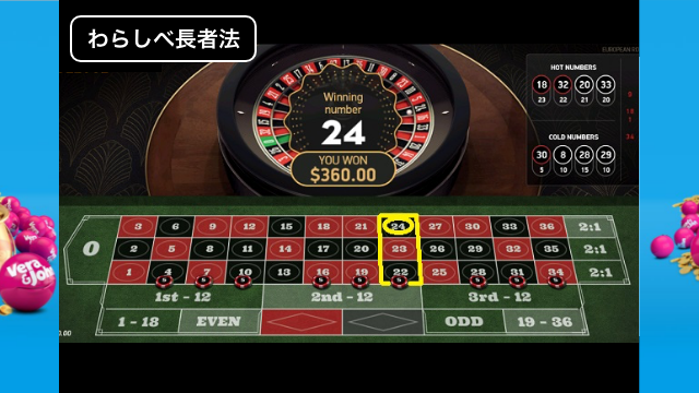 3つのダズンベットから2つ選んで、各12ユニット合計24ユニットを賭けます。