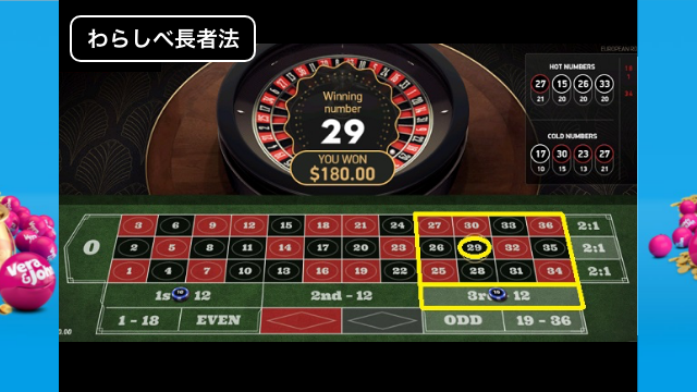 5ユニット賭けているエリアが当選したら、18ユニットの利益。2ユニット賭けているエリアが当選したら、36ユニットの損失。いずれも外して負けたら、72ユニットの損失です。