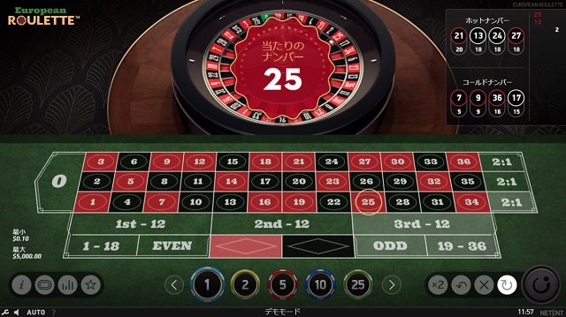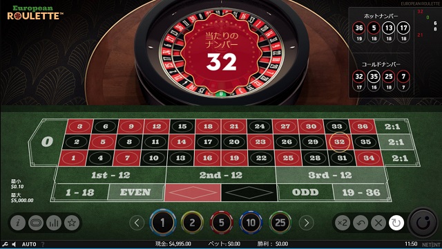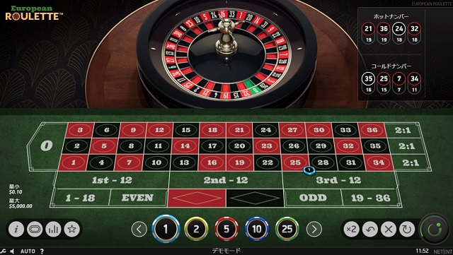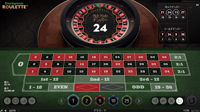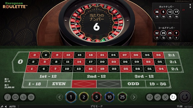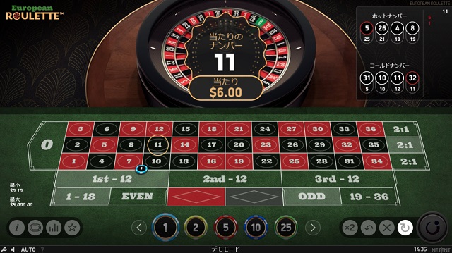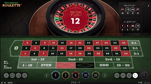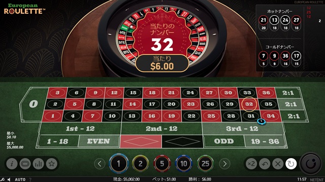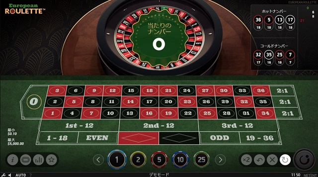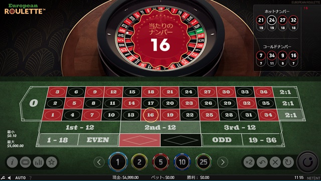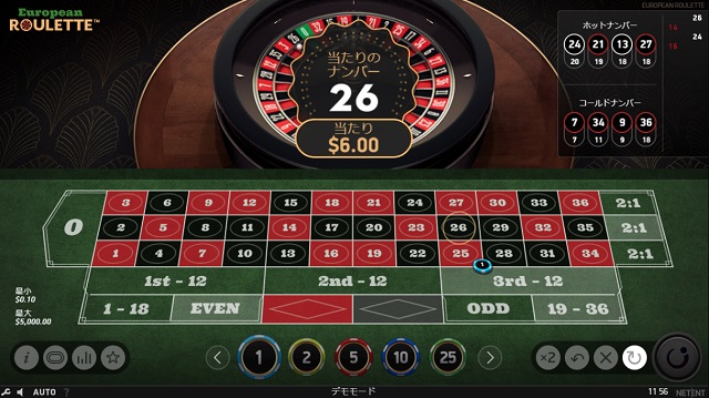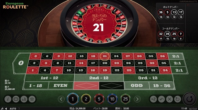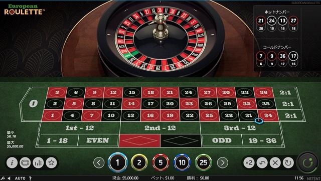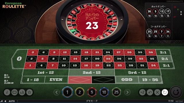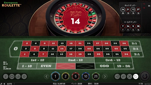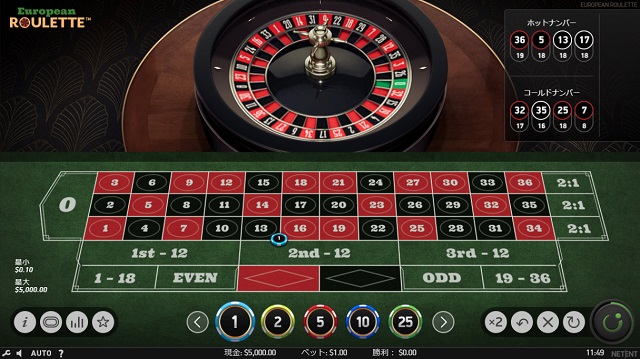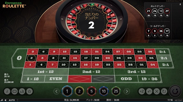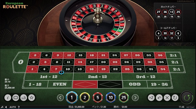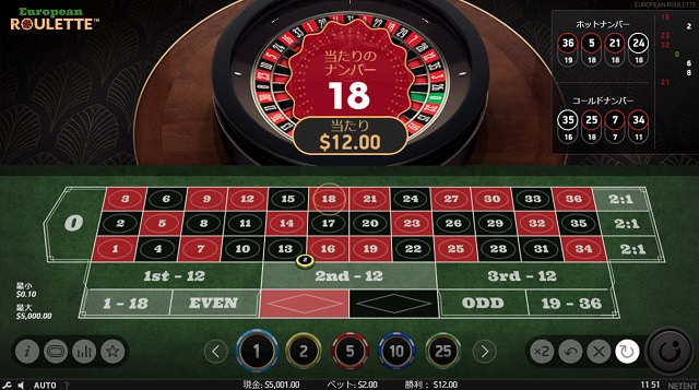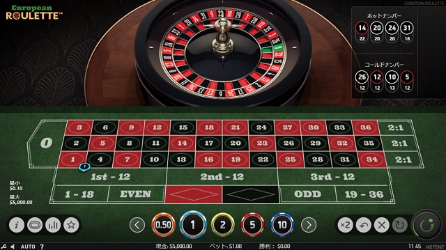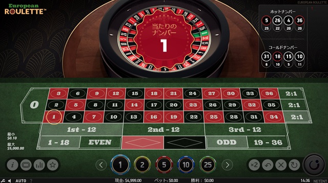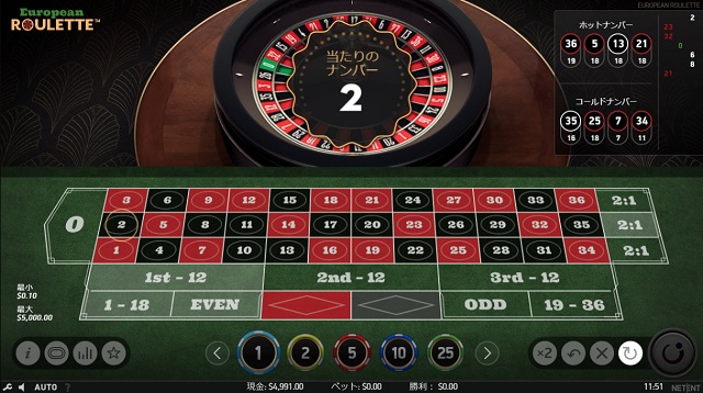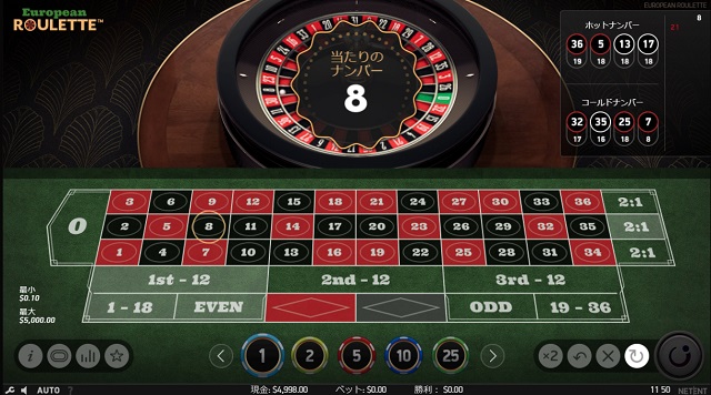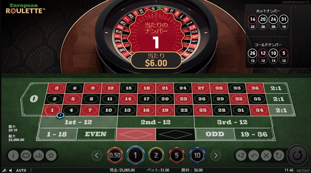 数字の個数が1個少ない分、ヨーロピアンルーレットの方が当たりやすく、還元率も高いので、ウィニングルーレット法を使用する際はヨーロピアンルーレットを選ぶようにしましょう。